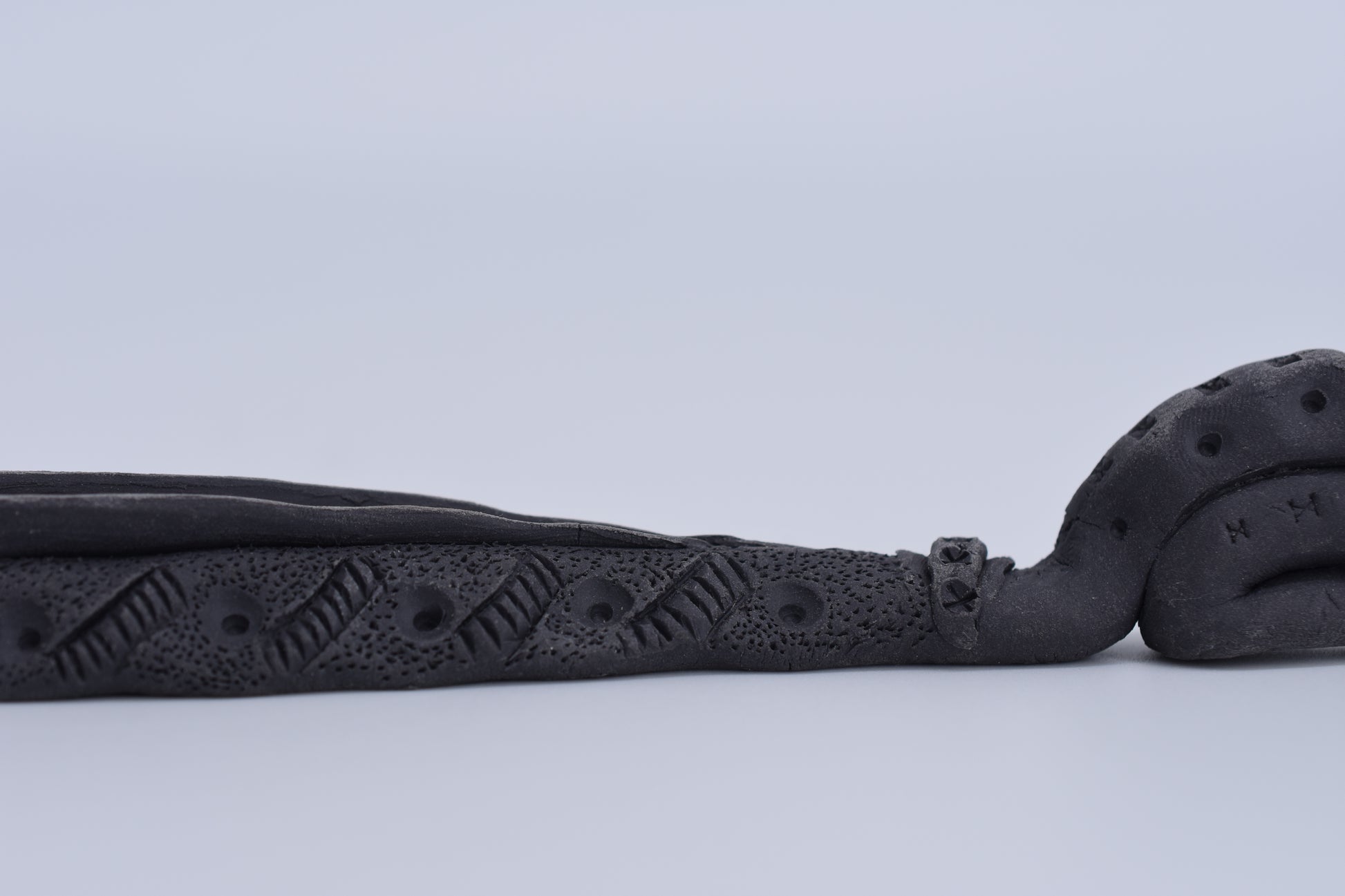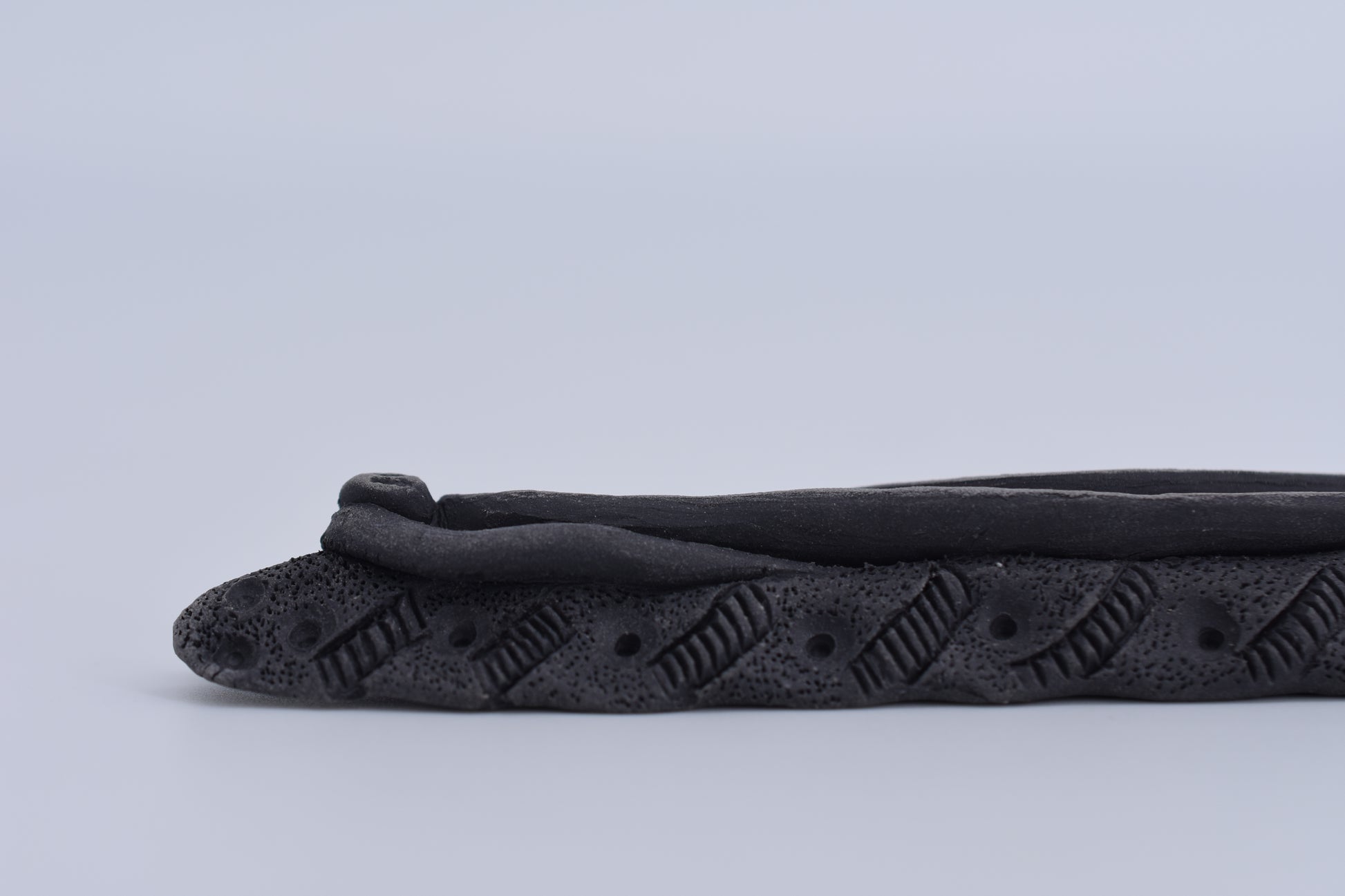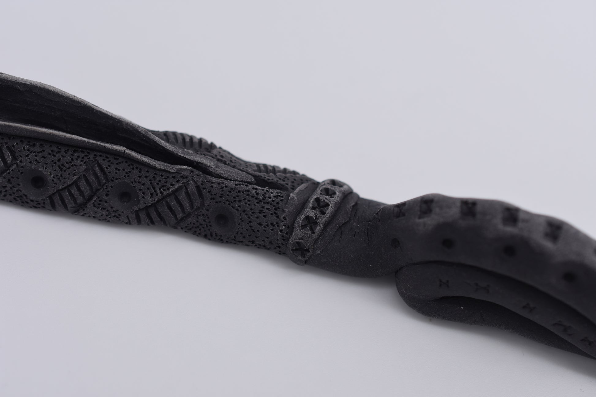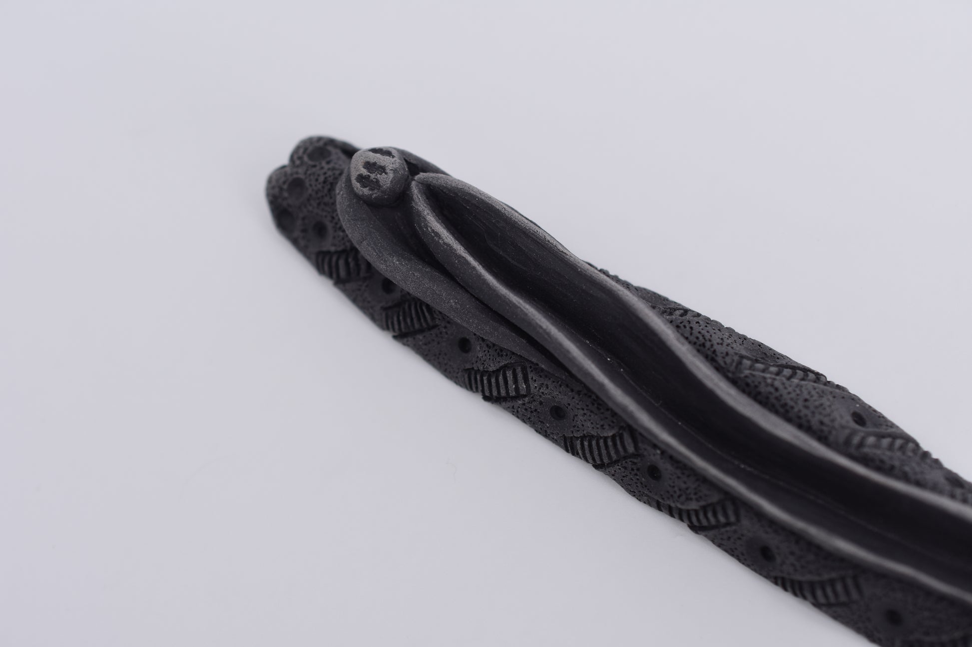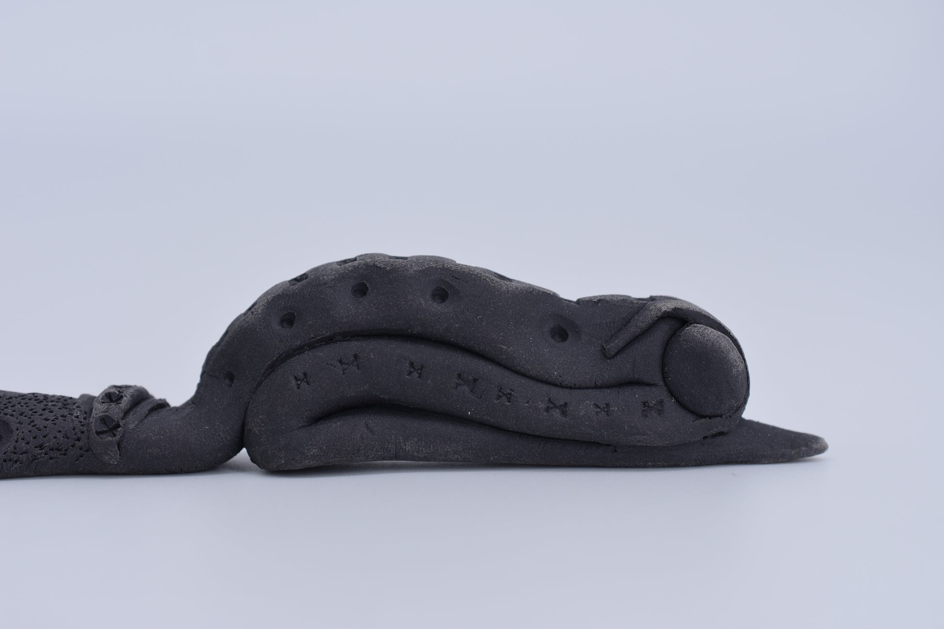 This long, low form is the most overtly figural of the series so far. Sculpted in black porcelain, Passage V unfurls from a flattened, vaginal base and resolves into a compressed humanoid figure resting at the head. Between the ends, a tapering body of ridges, cavities, and scored ornamentation suggests both mechanical housing and fleshy segments, repeating and distorting as if pressed through ritual.The figure appears to lie in a state of inwardness or return, cradled by the curving substrate beneath it. Across its length, textured bands, glyphs, and perforations seem to function like prayers or inscriptions—recording something vital and encrypted into the body of the piece itself. Passage V holds devotional weight. It is less ornamental than its predecessors and more sculpturally solemn, appearing less like a commodity and more like an offering. This is a reliquary for the libido’s retraction, a witness to the transformation of desire into form, rest, and encoded meaning.